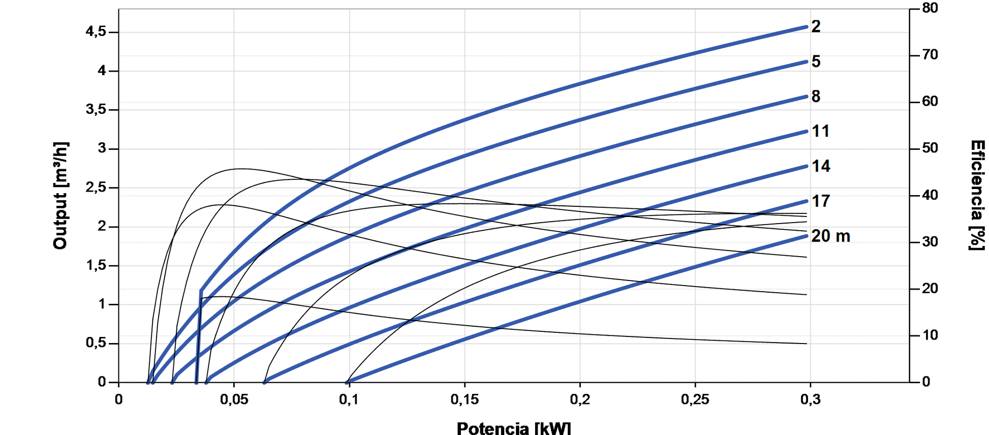 - Desempenho de referência: 4,6 m³/h de caudal e 20 m de altura (poços de 4").