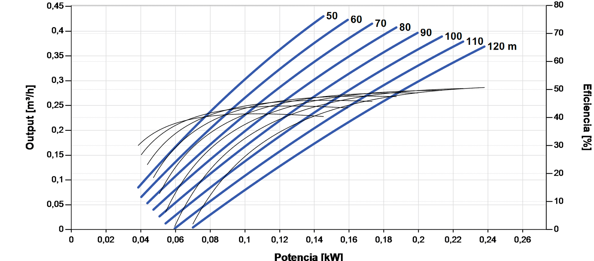 - Altura de referência de 120 m e caudal até 0,43 m³/h (grande pressão com caudal moderado).