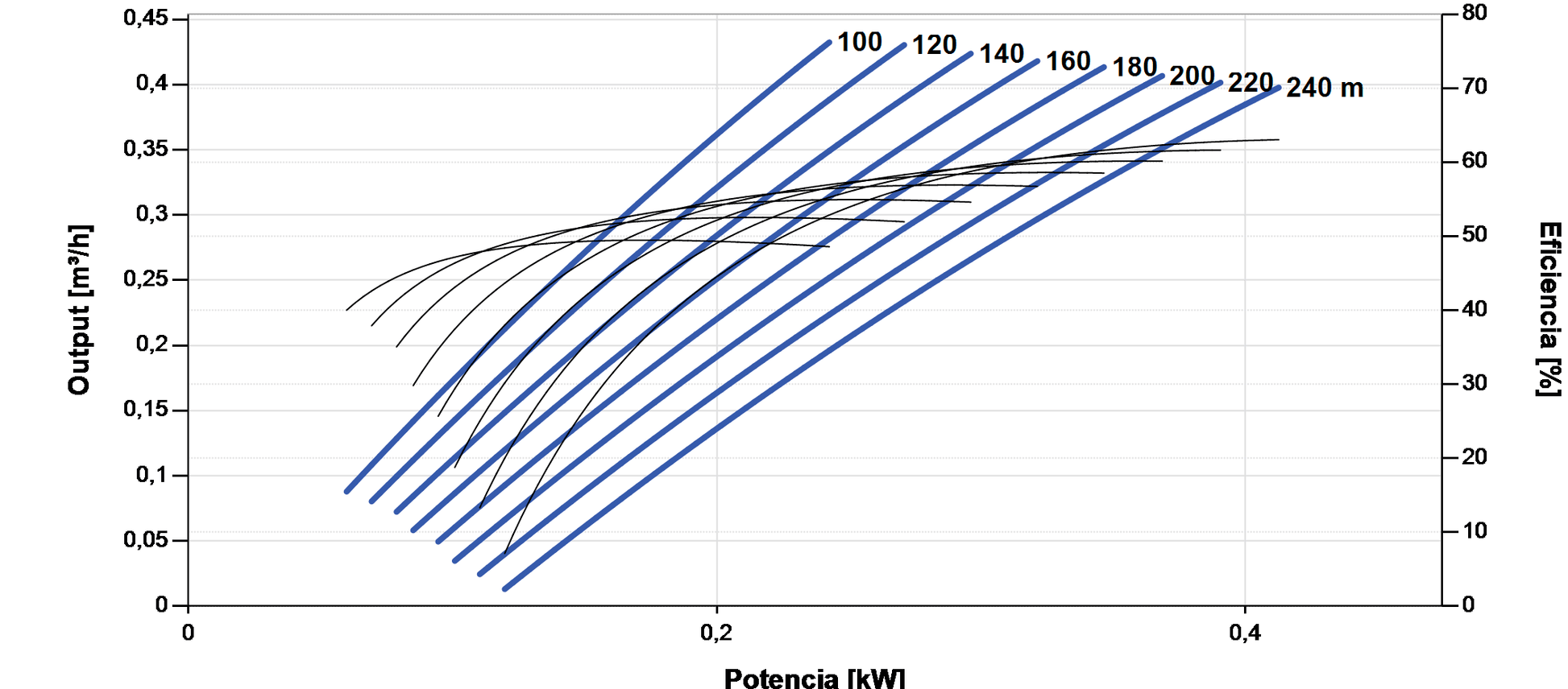 - Altura máxima de 240 m e caudal máximo de 0,43 m³/h (grande elevação com caudal controlado).