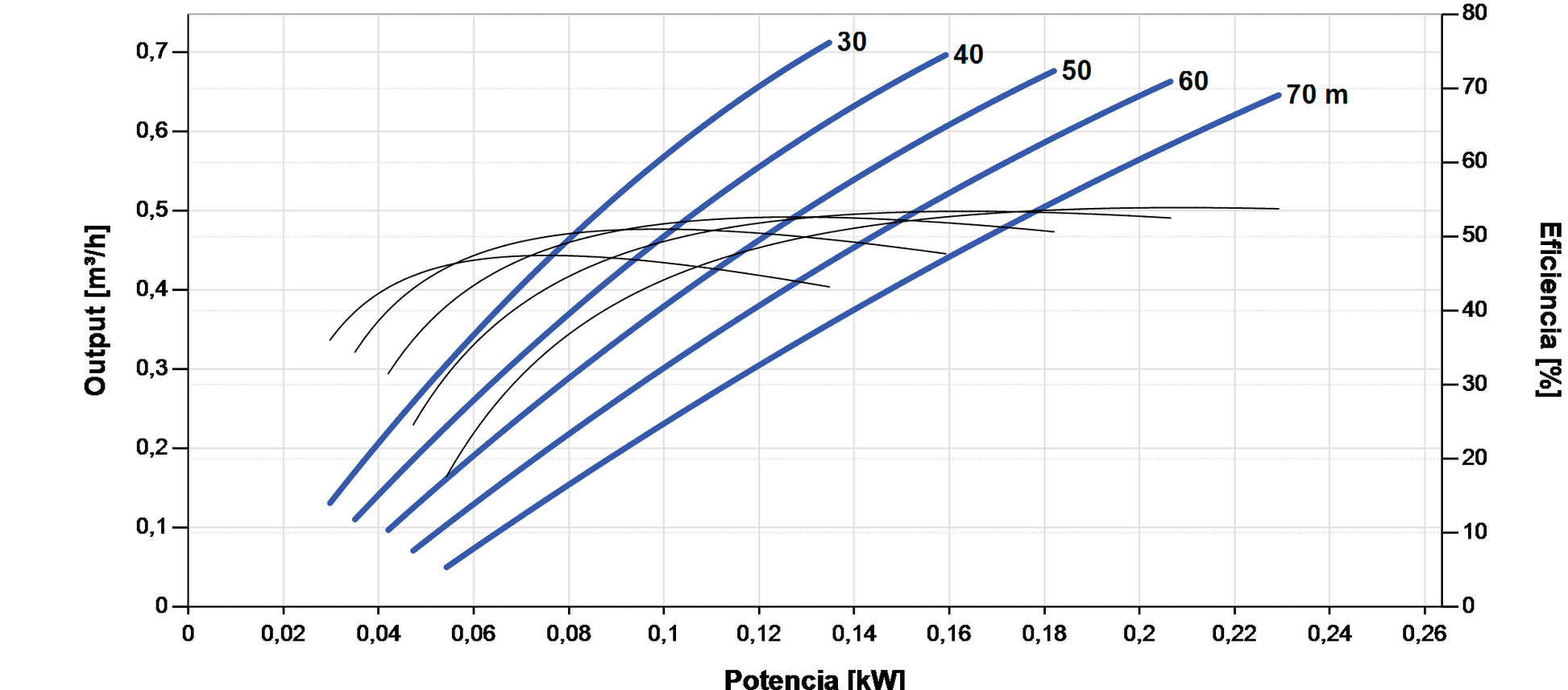- Altura de referência 70 m e caudal até 0,71 m³/h.