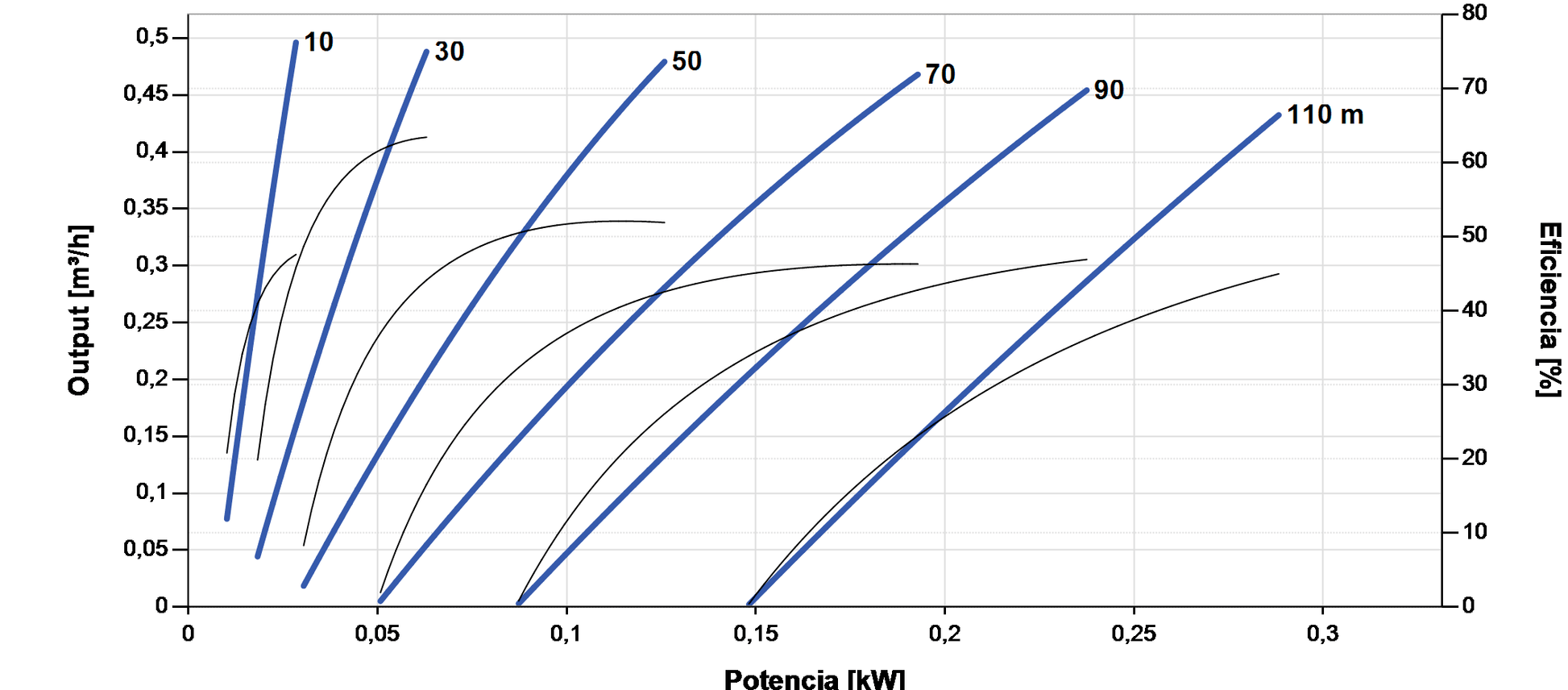 - Débito máximo de 0,50 m³/h (500 l/h) e altura máxima de 110 m, ideal para desníveis acentuados ou linhas longas.