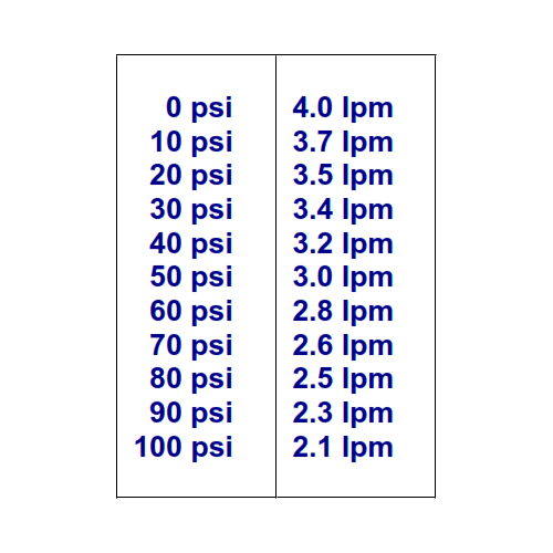 | Caudal | 4,0 l/min (0 PSI) · 3,2 l/min (40 PSI) · 2,1 l/min (100 PSI) |