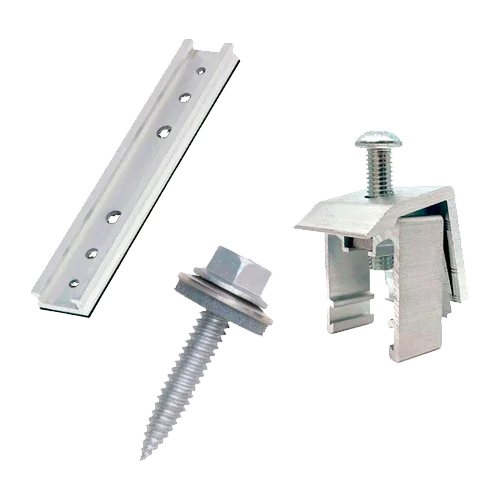Grapas finais e intermédias 30/35 mm, clips de ligação à terra por módulo, passacabos e braçadeiras UV. Utilizar sempre fita/aros EPDM sob cada fixação à chapa e verificar a continuidade equipotencial da fila.