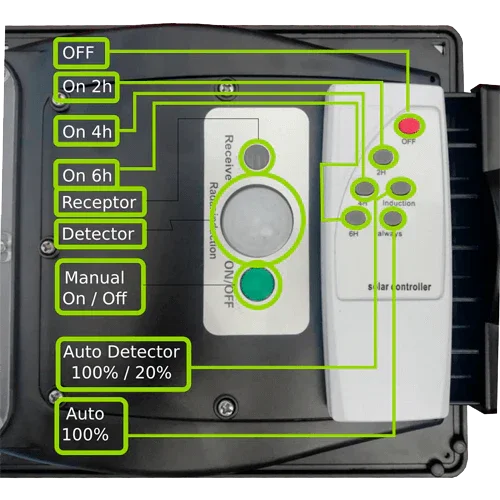 - Comando remoto: ligar/desligar, 2/4/8 h, automático crepúsculo/amanhecer, meia ou plena potência.